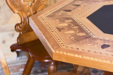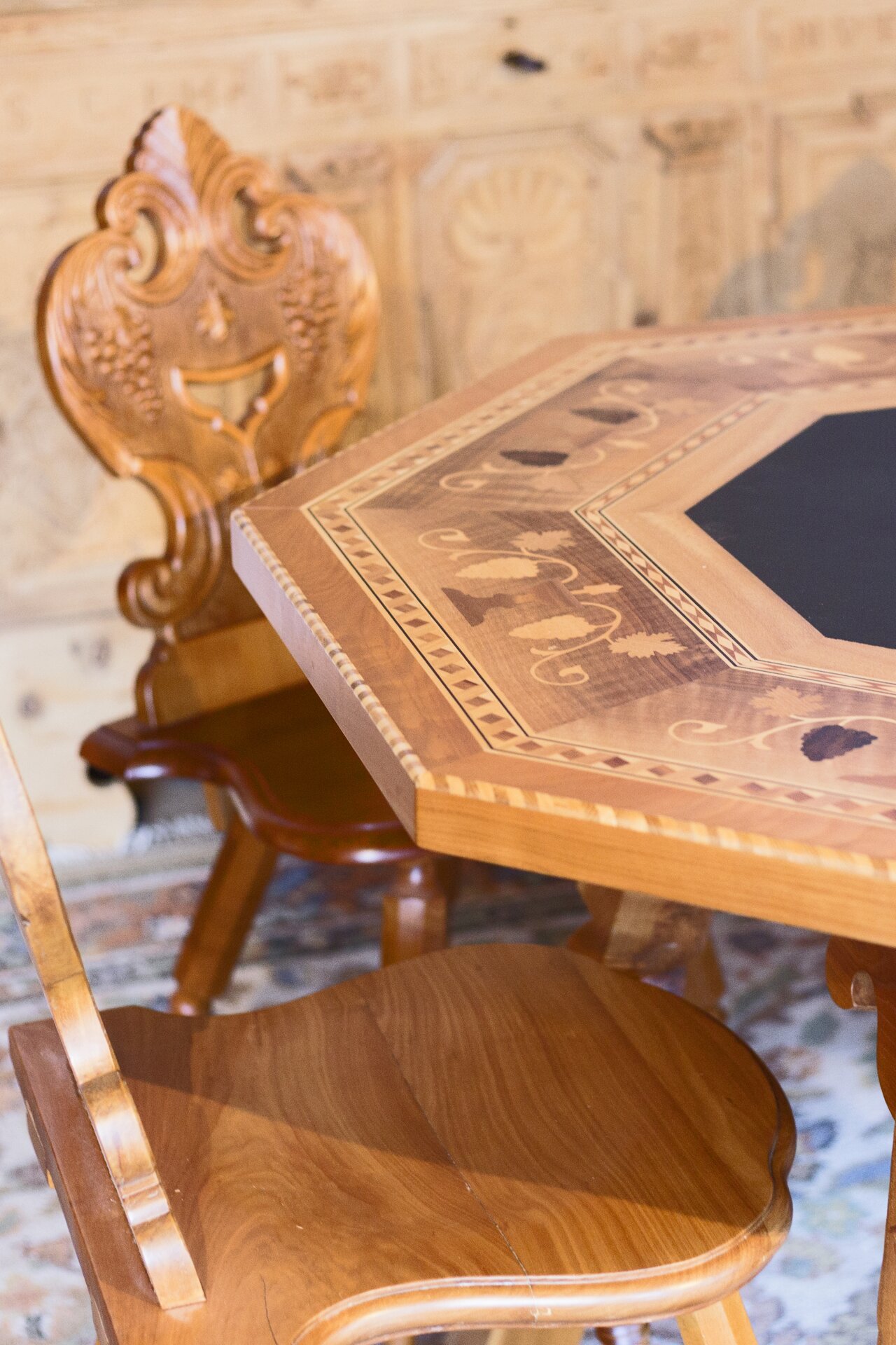 … und der Teller kommt auf den Tisch – auf den Montafonertisch. Er ist an seiner achteckigen Platte mit Intarsien, den gebrochenen Ecken, der Schiefertafel in der Mitte und den schrägen Beinen leicht zu erkennen.