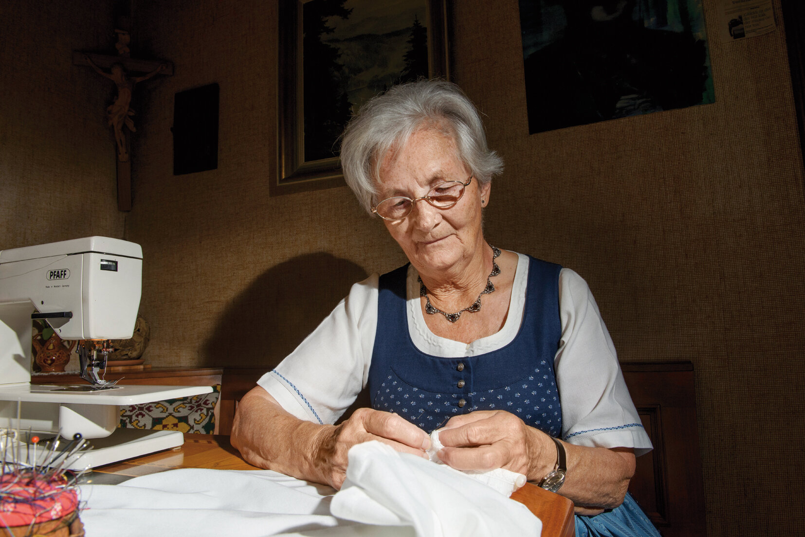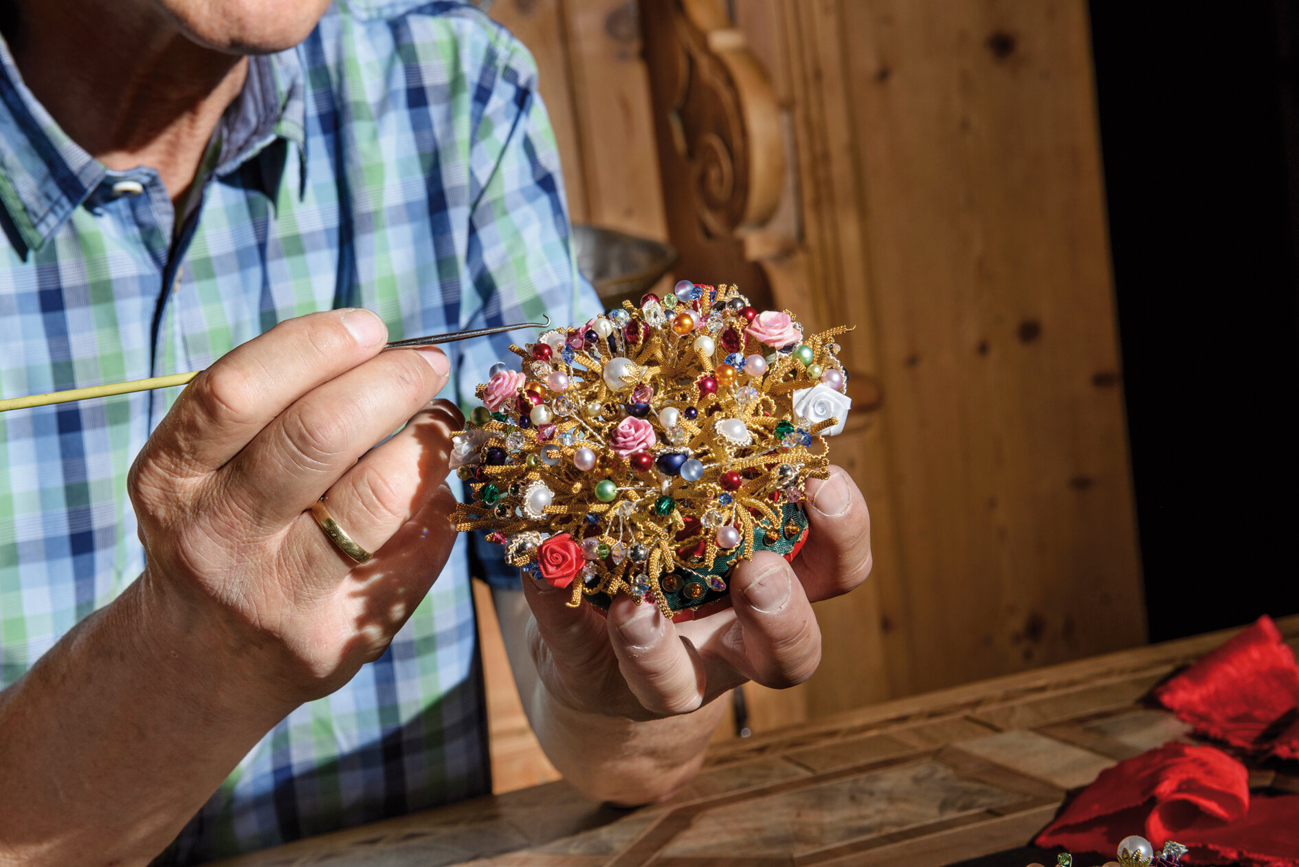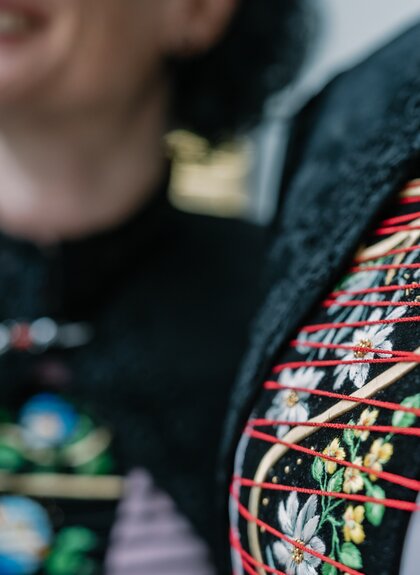 „Besonders die handgefertigten Verzierungen machen sie so kostbar“, erklärt Ulrike Bitschnau vom Landestrachtenverband Vorarlberg. Heimische Blütenmotive und Goldschlingen schmücken Schürzenbänder, Kragen, Ärmel der Glöggletschopa, Zopfbänder und das Brusttuch – allein diese Stickereien erfordern rund 500 Stunden Arbeit.