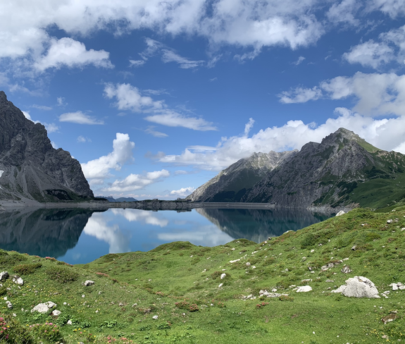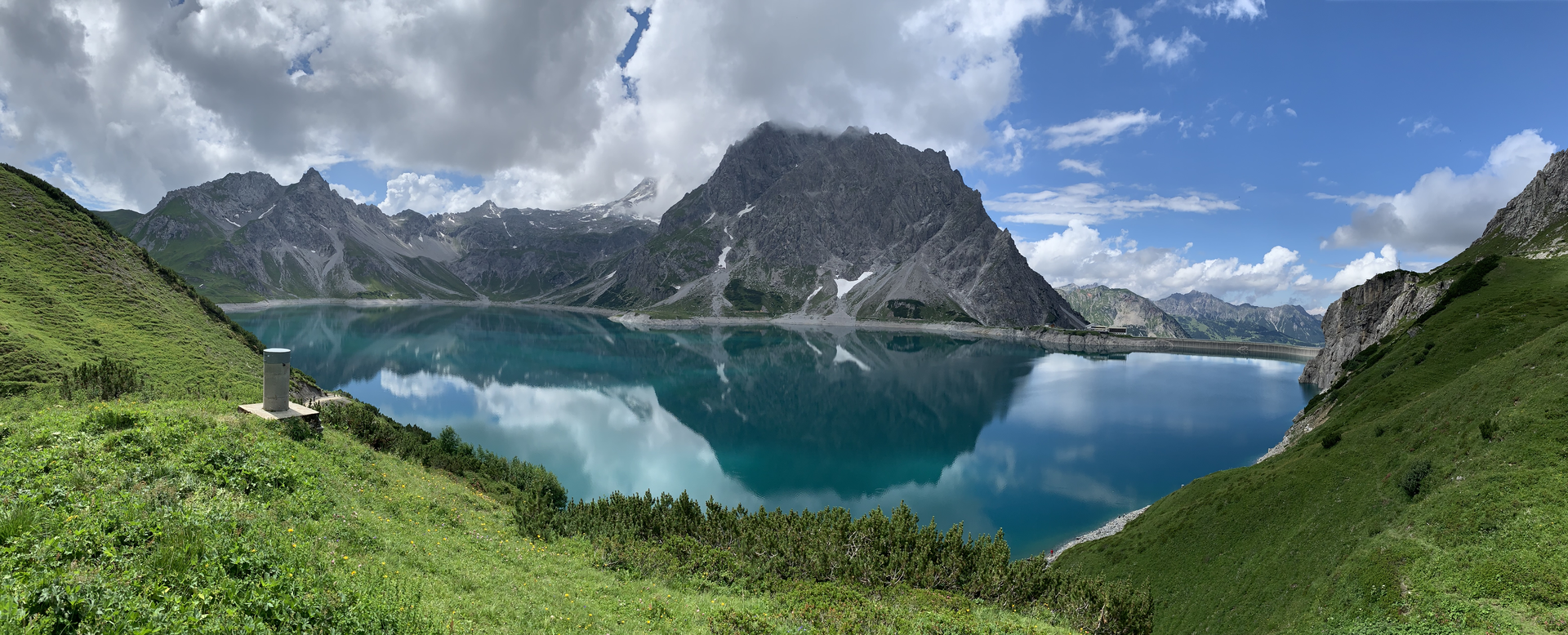 Die zweite Etappe startet auf der Staumauer und Du umkreist der restlichen Teil des Lünersee. Wieder vorbei an der Alpe Lünersee führt dich der Weg hinauf zum Gafalljoch (2.239 m). Herzlich Willkommen in der Schweiz. In weiter Ferne kannst du bereits von hier die Carschinahütte sehen.