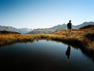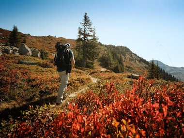 Knöchelhoche Bergschuhe mit gutem Profil, Sonnen- und Regenschutz, ausreichend Wasser und Verpflegung