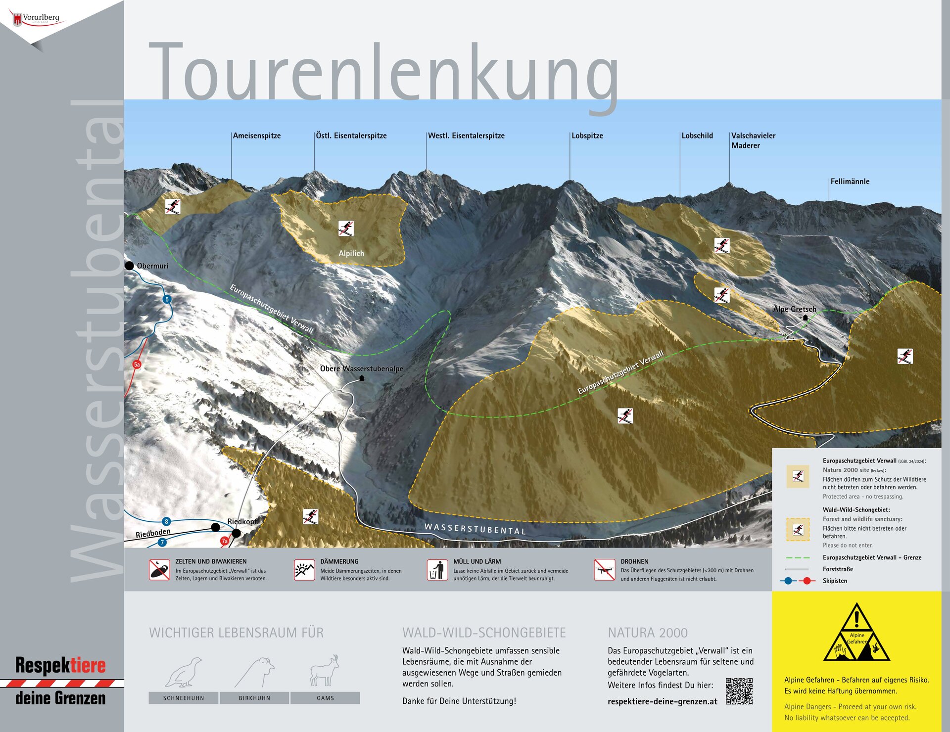 Bei Skitouren im Bereich der Alpe Gretsch (Lobspitze, Fellimännle) ist ausnahmslos über den Forstweg von der Alpe Gretsch in das Wasserstubental bzw. weiter in das Silbertal abzufahren. Sämtliche Schneisen und Lawinenrinnen, die ins Wasserstubental oder Silbertal führen, sind zu meiden, ebenso wie die waldnahen Bereiche der Alpe Gretsch. Bitte beachte die Orientierungshilfen im Gelände.