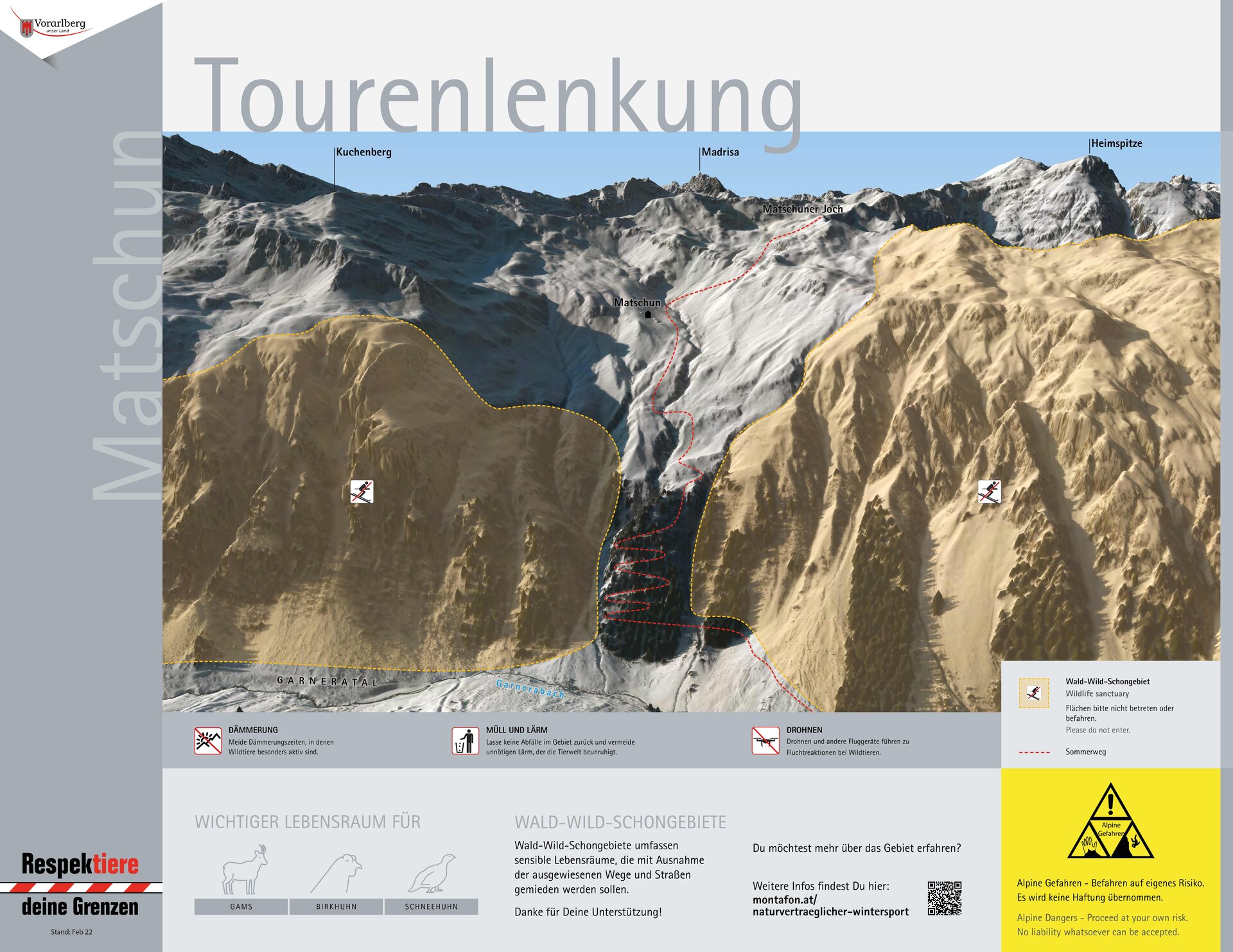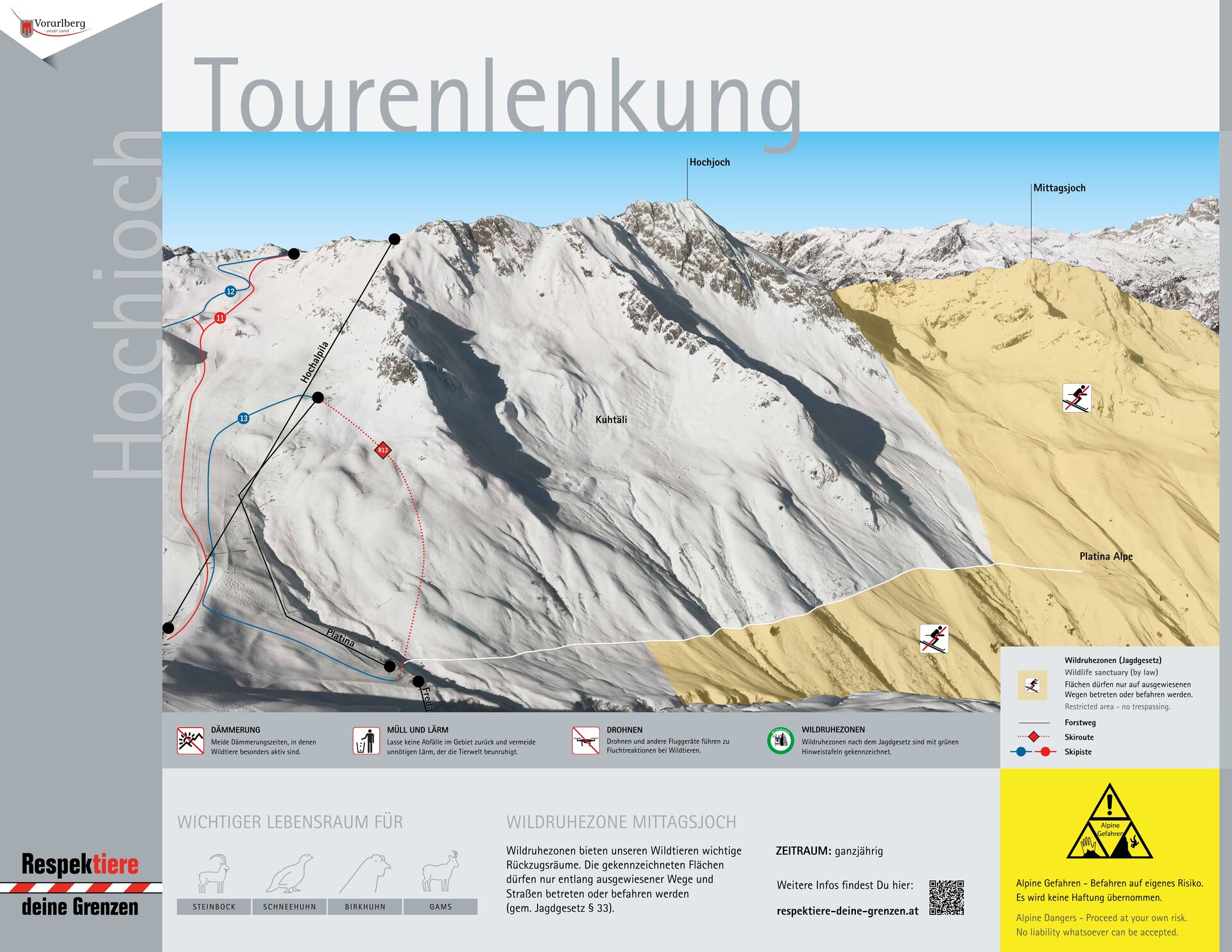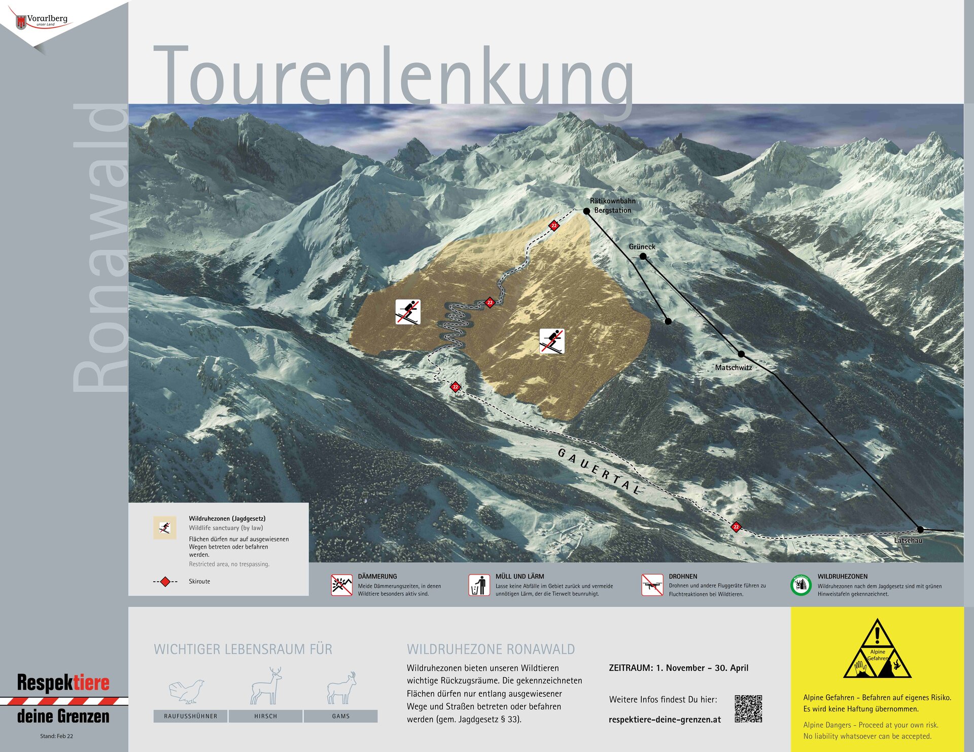 Wald und Waldrandbereiche sind häufige Aufenthaltsorte für Wildtiere und sind deshalb zu meiden, insbesondere im Nahbereich des Skigebiets Sonnenkopf (hier gilt das Befahrungsverbot gem. Forstgesetz) sowie zw. Hochburtscha und Fellimännle (siehe auch Tourenlenkung Gretsch). Bitte beachte die eingezeichneten Rückzugsräume für Gams, Schnee- und Birkhühner im Europaschutzgebiet „Verwall“.