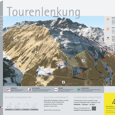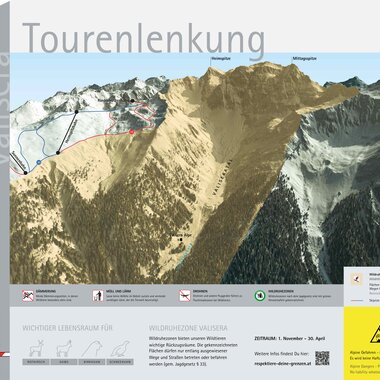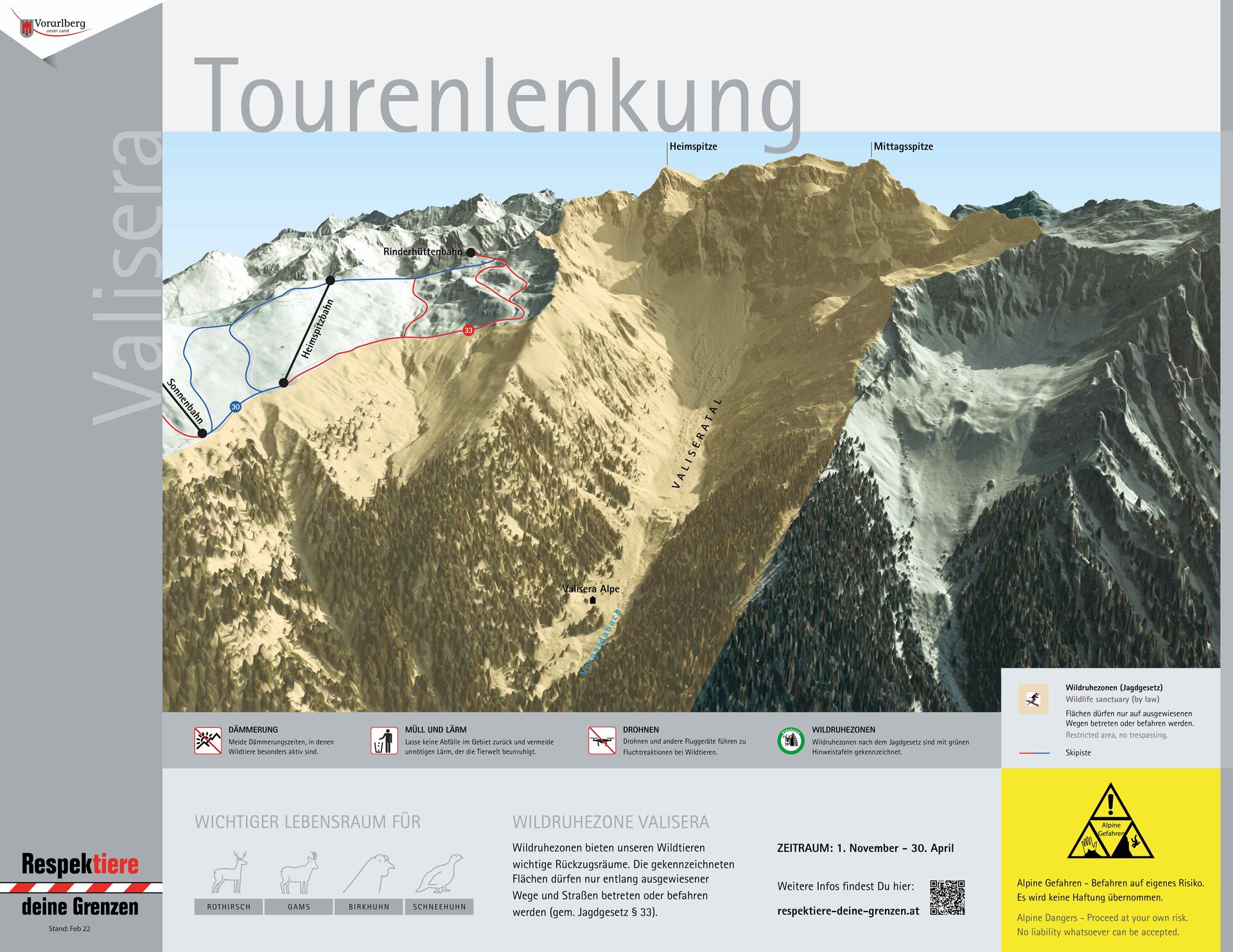 Im Valisertal gilt im Bereich der Wildruhezone von 01. November bis 30. April ein generelles Wegegebot. Skitouren und Variantenabfahrten in das Valiseratal sind somit bis auf Weiteres untersagt.