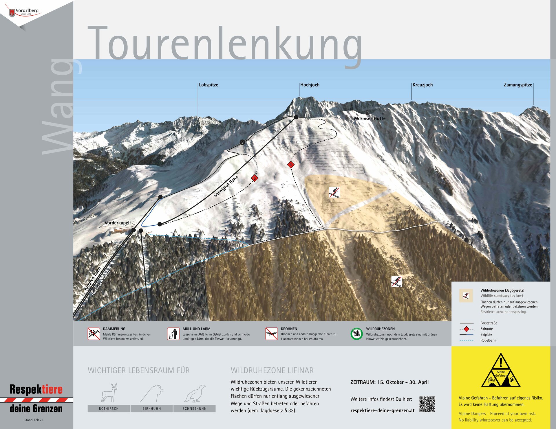 Im Bereich der Variantenabfahrt "Wang" ist auf die bestehende Wildruhezone "Lifinar" (15. Oktober bis 30. April) zu achten. Ein schmaler, befahrbarer Korridor ist durch eine entsprechende Orientierungshilfe im Gelände gekennzeichnet. Die Flächen unterhalb der Forststraße (Verbindungsstraße zur Bergstation Kropfen/Zamang) sind ausnahmslos zu meiden.