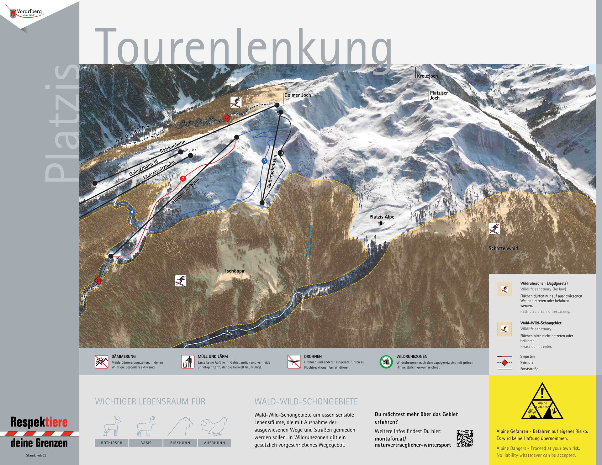 Bei Skitouren im Bereich Kreuzjoch und Abfahrt über die Platzisalpe ist der Korridor bzw. die Schneise über den Platziserzipfel zu wählen. Andere Schneisen und Schläge im Bereich des Golmerbaches sind Aufforstungs- bzw. Jungwuchsflächen und sind somit zu meiden. Die weitere Abfahrt nach Vandans über Ganeu hat ausschließlich über den Forstweg zu erfolgen.