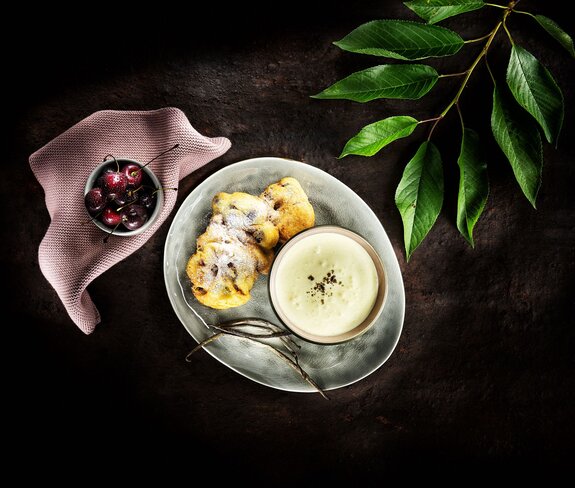 300 g Kirschen entkernt und halbiert, 100 g Mehl, 2 Eier, Abrieb einer halben Zitrone, 1 Schuss Kirschwasser oder Amaretto, 1 Prise Vanillezucker, 1 Prise Salz, 1 EL Ländle Rahm, Butterschmalz.