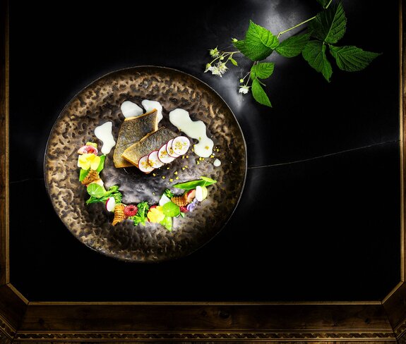 Saiblingsfilet mit Bärlauch​-​Erdäpfelpüree und glacierten Himbeer​-​Radieschen