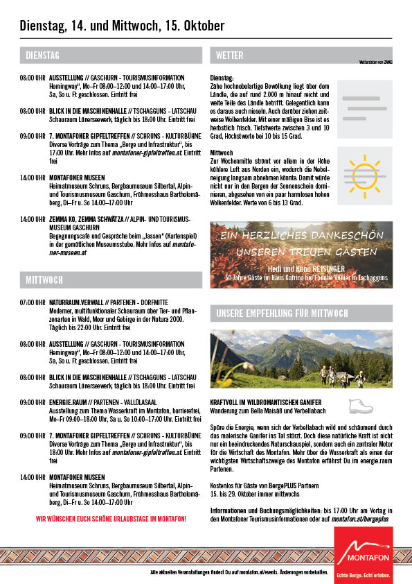 "Uns liegt es am Herzen, dass Du eine schöne Zeit bei uns im Montafon hast. Deshalb möchten wir Dir für Heute und Morgen ein paar Empfehlungen mit auf den Weg geben. Wir wünschen Dir viel Freude!"