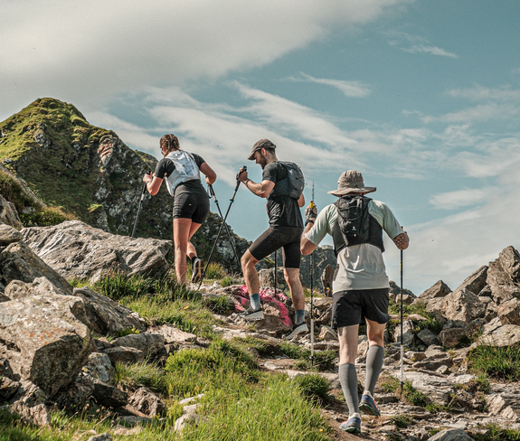 Klassische Trailrunning-Ausrüstung (Trailrunning-Schuhe und Kleidung, Weste mit Verpflegung,...).