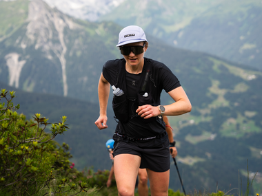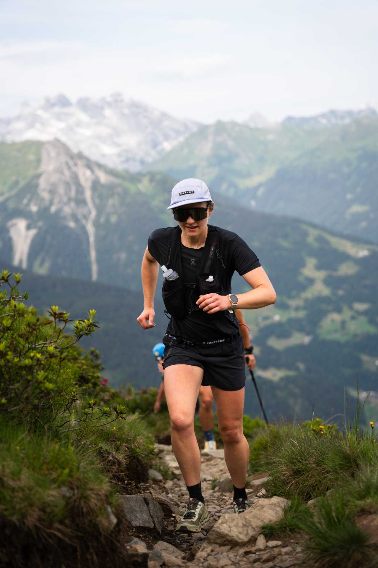 Klassische Trailrunning-Ausrüstung (Trailrunning-Schuhe und Kleidung, Weste mit Verpflegung,...).