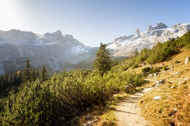 Weiße Steinriesen vor blühenden Wiesen und grasendem Montafoner Braunvieh, frische Bergquellen, dazu das türkisblaue Wasser des Lünersees. Eintauchen und auftanken, dafür ist dieser Lebensraum wie geschaffen. Mit etwas Glück schauen Gämsen von den Gipfeln und es pfeifen die Murmeltiere.