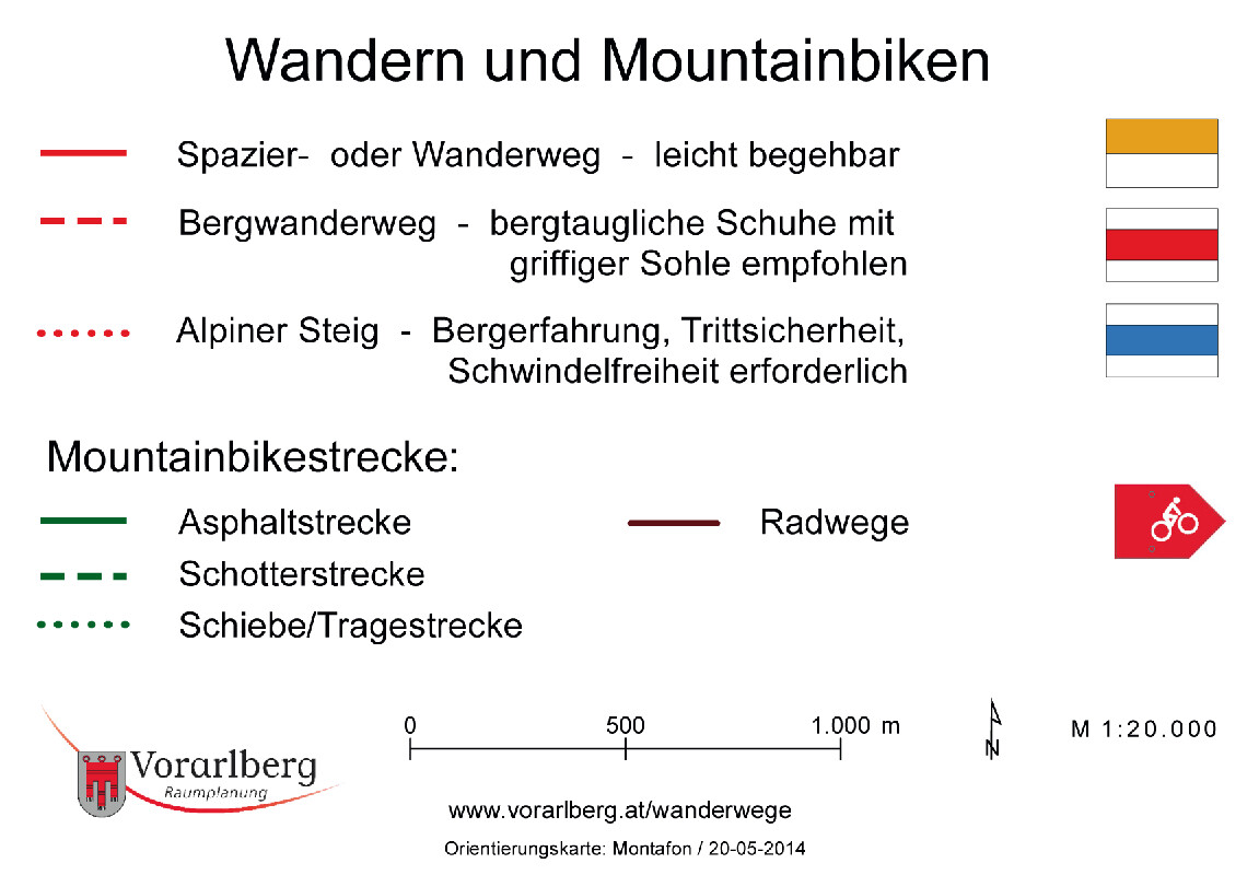 Bei uns im Montafon sind alle Wanderwege einheitlich nach dem Vorarlberger Wanderwegekonzept markiert. Dabei werden die Wanderwege in drei Schwierigkeitsgrade unterteilt, die sich anhand der Farbmarkierung ablesen lassen:er- und Wanderweg – leicht begehbar, bequem, hohe Sicherheit, in der Regel gut ausgebaute Wege, für alle Altersgruppen geeignet
