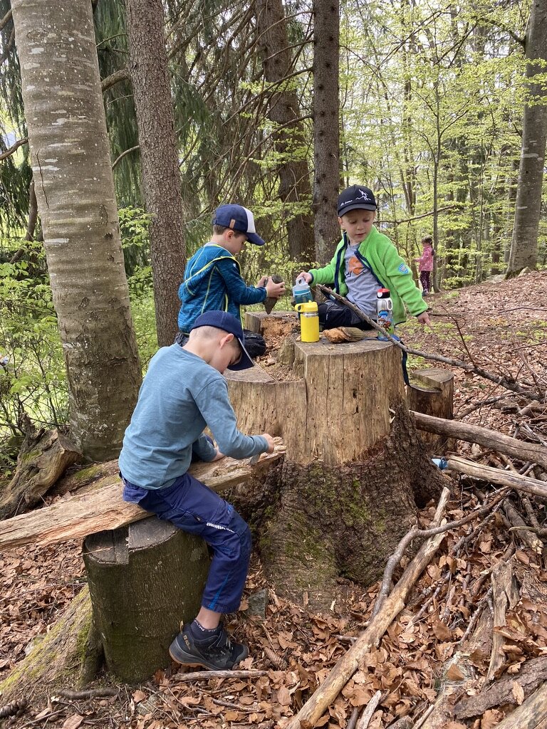 Auch Feuerschalen entstanden und Spiegeleier aus Tannenzapfen wurden gebraten. „Heute gibt es Spiegeleier, schau wie viele Tannenzapfen wir dafür schon gesammelt haben", zeigte Theresa mit einem strahlenden Gesicht.