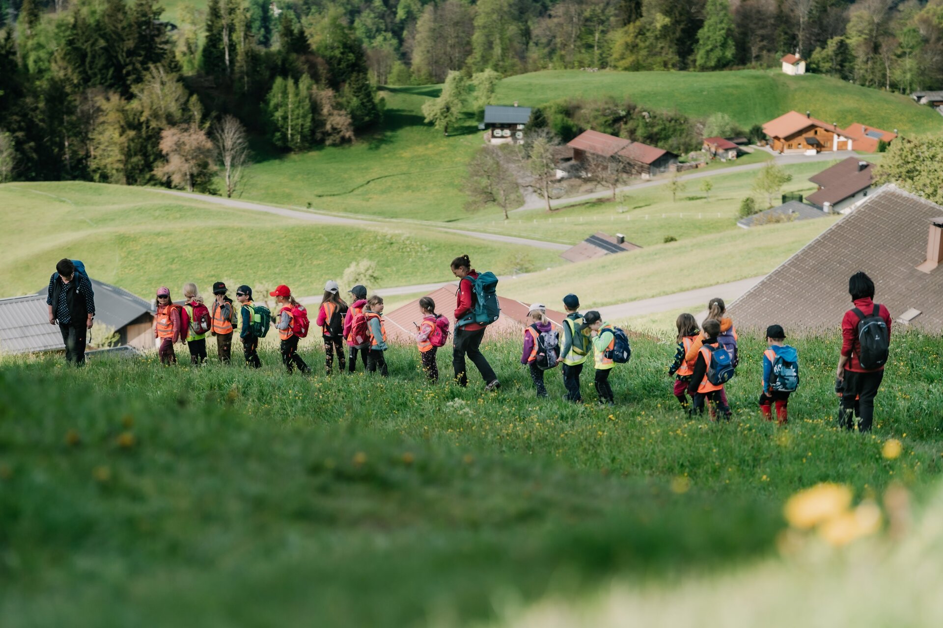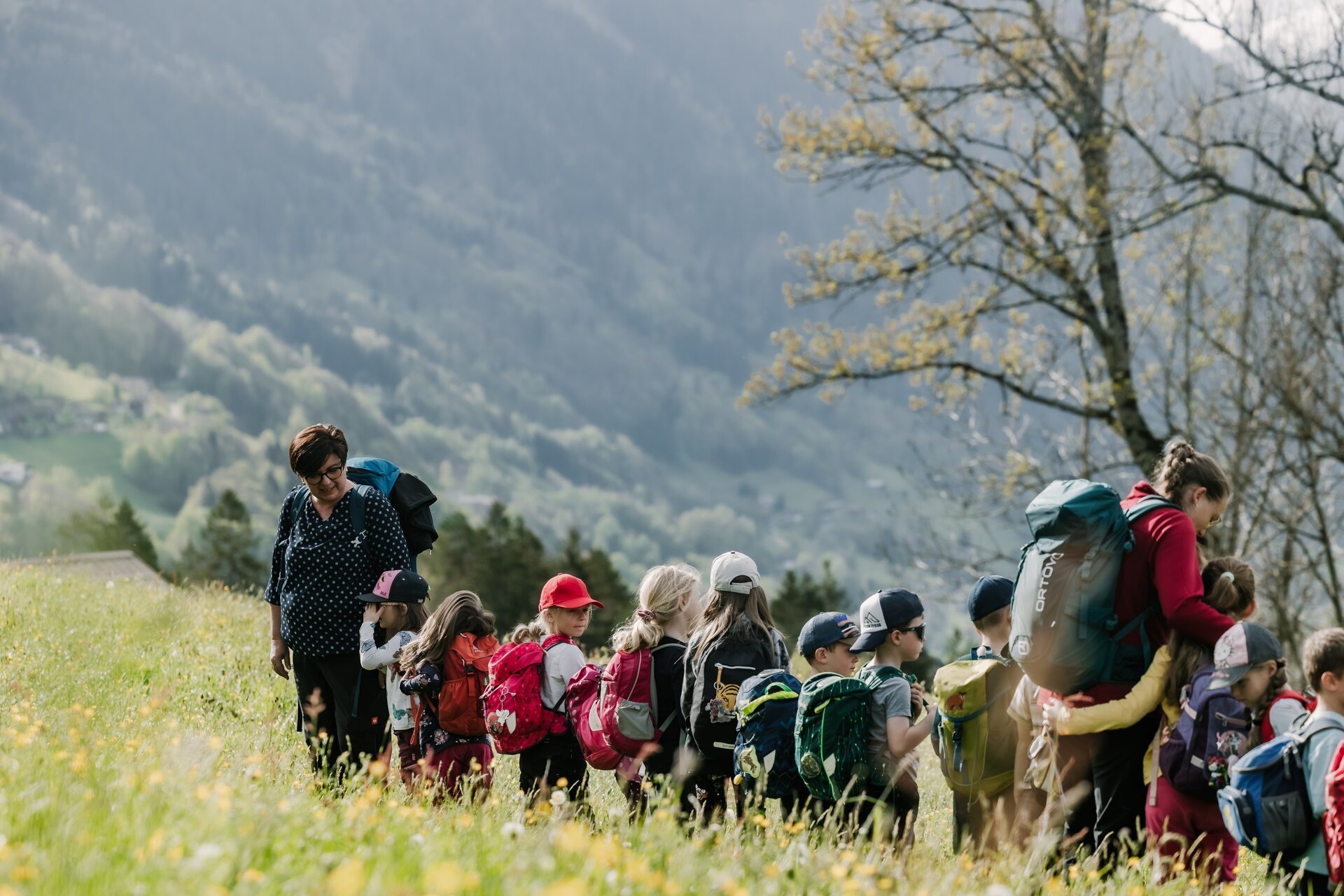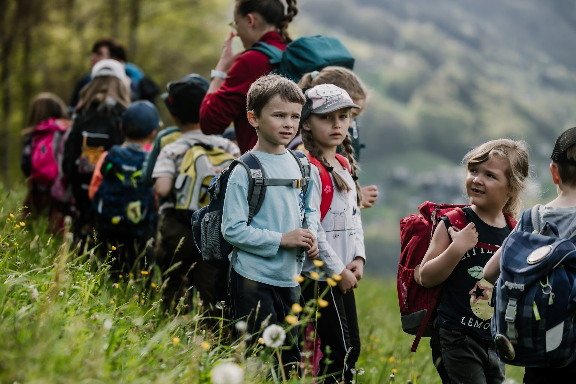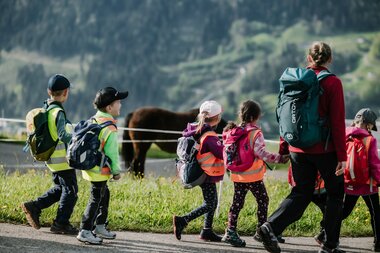 Die Hennatschätter Gruppe des Kindergartens Bartholomäberg machte sich voller Vorfreude auf den Weg in den Wald. Der Wald, der so nah am Kindergarten liegt, ist für die Kinder immer ein Ort voller Abenteuer und Geheimnisse. Schnell waren die Rucksäcke umgeschnallt und schon begann die Wanderung auf interessanten Wiesenwegen, vorbei an Jessica, dem Pferd, das auf der Weide graste. Unterwegs gab es eine kurze Trinkpause an einem alten Baum, der für die Kinder als natürliche Klettermöglichkeit diente.