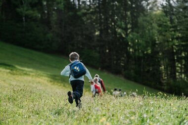 Zusammen mit ihren Kindergartenpädagoginnen Christine, Evi und Tiada wanderten die Kinder voller Stolz weiter auf dem Weg, der sie zum besagten Wald führte, vorbei an einer sogenannten „Magerwiese“. „Eine Magerwiese wird höchstens zwei Mal im Jahr gemäht. Infolgedessen entstehen artenreiche Wiesen. Die bunte Mischung aus Blumen, Gräsern und Kräutern bietet einen idealen Lebensraum für Insekten aller Art", erklärte Christine.