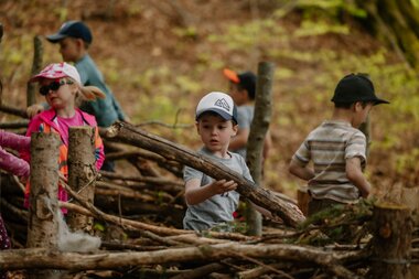 „Es ist für die Kinder immer etwas ganz Besonderes, Zeit in dieser natürlichen Umgebung zu verbringen und zu entdecken, was alles möglich ist", erklärte Bernhard. So wurden Äste gesammelt, die zum Bauen eines Zauns dienten, aber auch kreative Ideen entstanden in den Köpfen der Mädchen und Buben, wie zum Beispiel ein Flatsceen TV aus Ästen. Der Tannenzapfen diente als Fernbedienung.