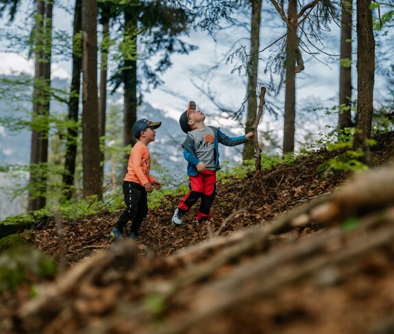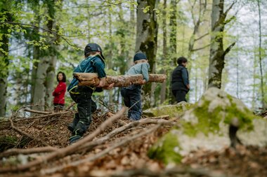 Als die Kinder im Wald ankamen, wurden sie bereits von Bernhard erwartet. Zusammen mit seiner Frau Christine, der Kindergartenpädagogin im Kindergarten Bartholomäberg, ermöglicht er den Kindern, die Natur auf eine besondere Art und Weise zu erleben. Durch ihren Wald, den sie dem Kindergarten mehrmals im Jahr zur Verfügung stellen, lernen die Kleinen nicht nur mit natürlichen Spielzeugen zu spielen, sondern auch den Respekt vor der Natur zu entwickeln.