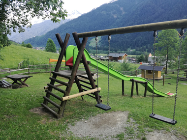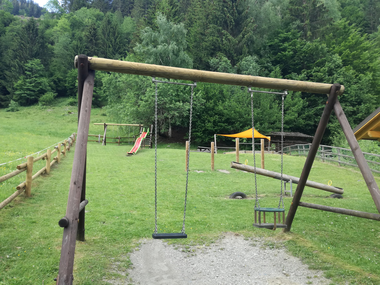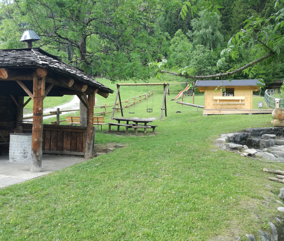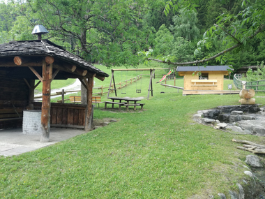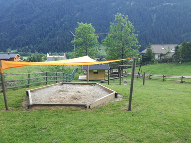 Am Sonnenhang gelegener öffentlicher Spielplatz mit Blockhaus, Schaukel, Wippe, Kletterstange, Grillmöglichkeit, Wasser, Sandkasten etc...