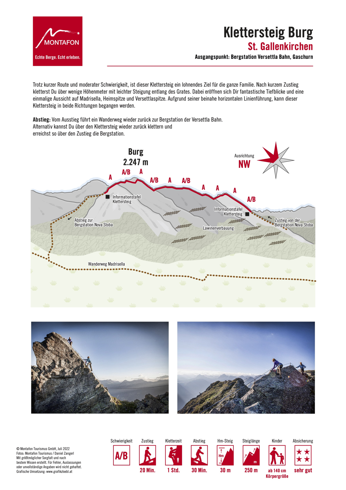 Despite the short route and moderate difficulty, this via ferrata is a rewarding destination for the whole family. After a short approach, you climb a few altitude meters with a slight incline along the ridge. Fantastic views down and a unique panorama of Madrisella, Heimspitze and Versettlaspitze open up. Due to its almost horizontal line, this via ferrata can be climbed in both directions.