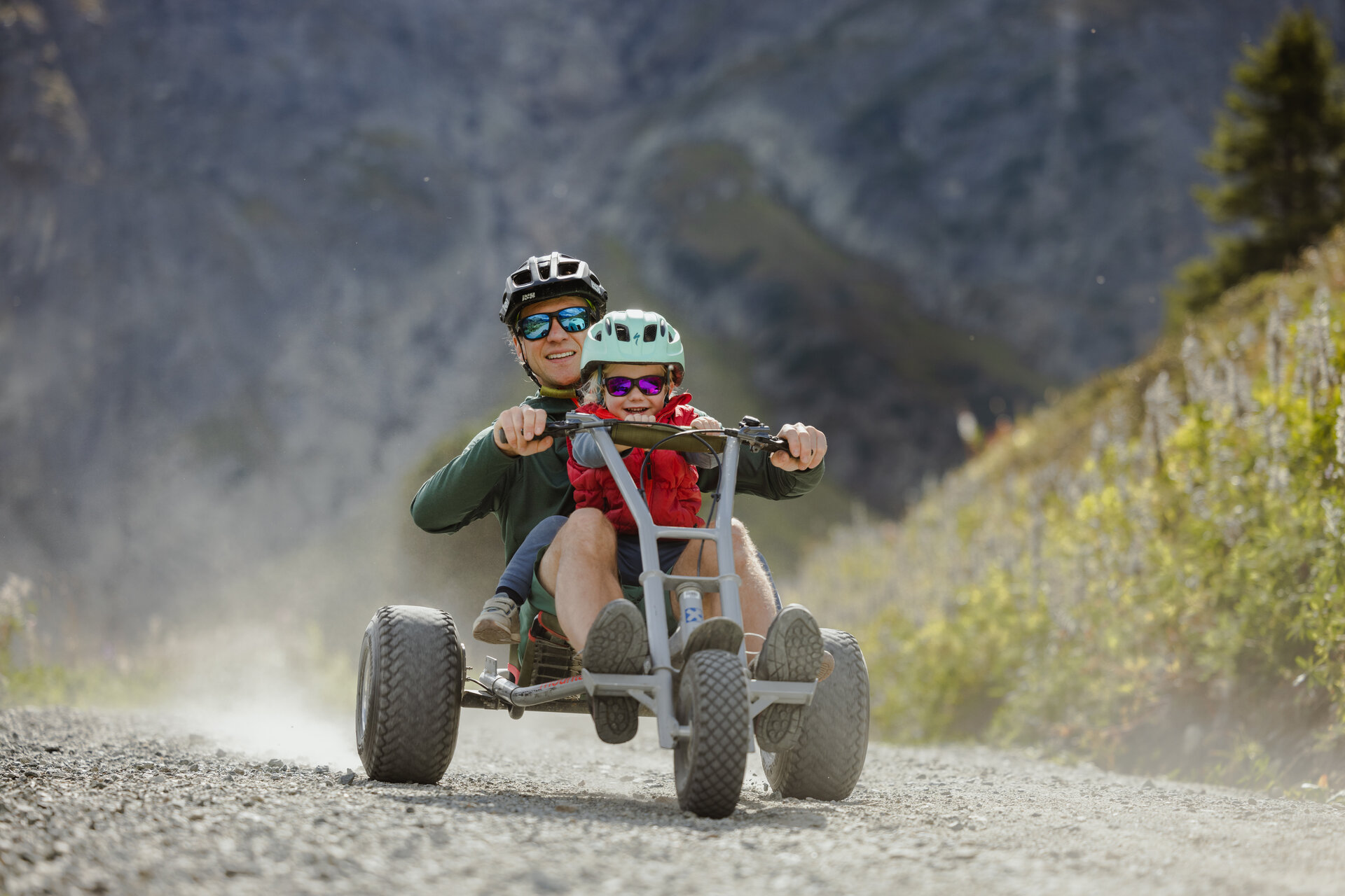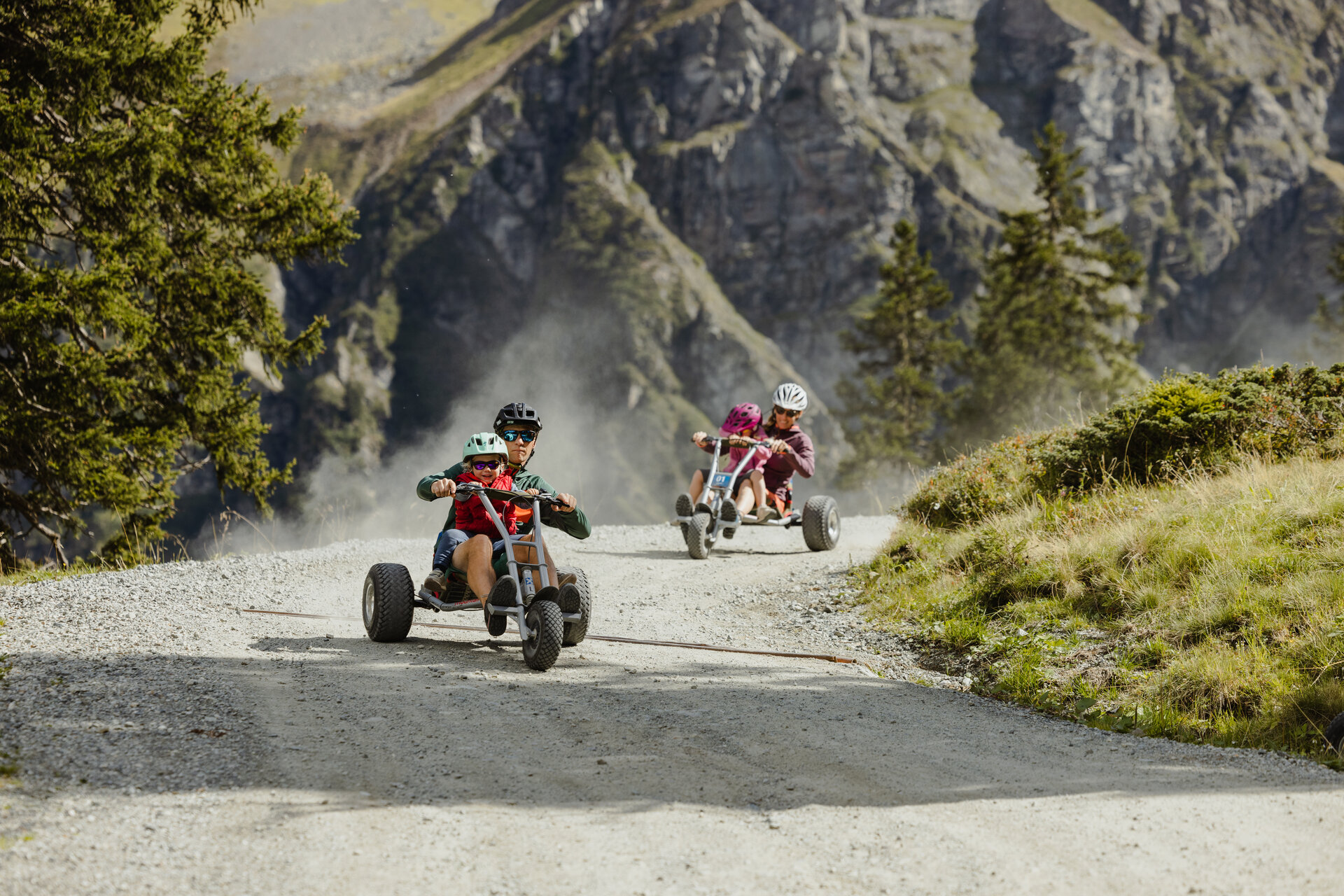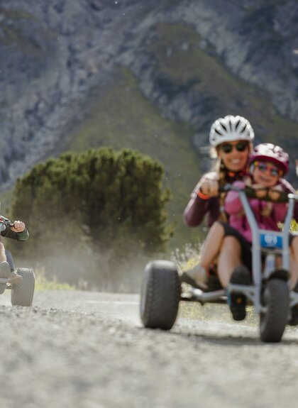 - Wenn ein Erwachsener und ein Kind gemeinsam auf einem Mountaincart fahren, wird empfohlen ein größeres Cart bei der Buchung auszuwählen