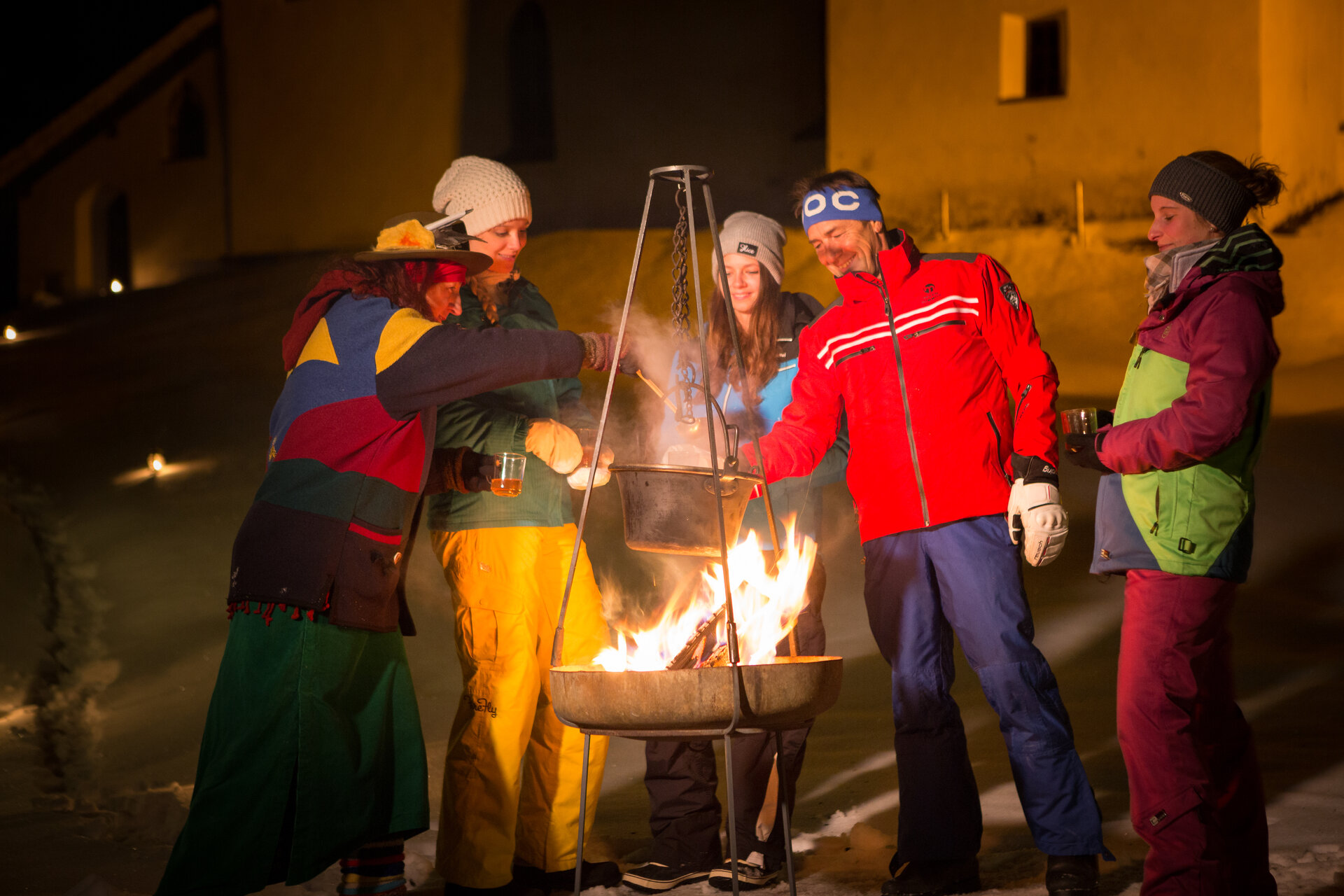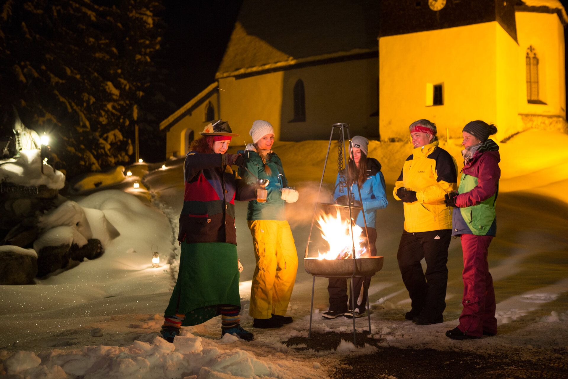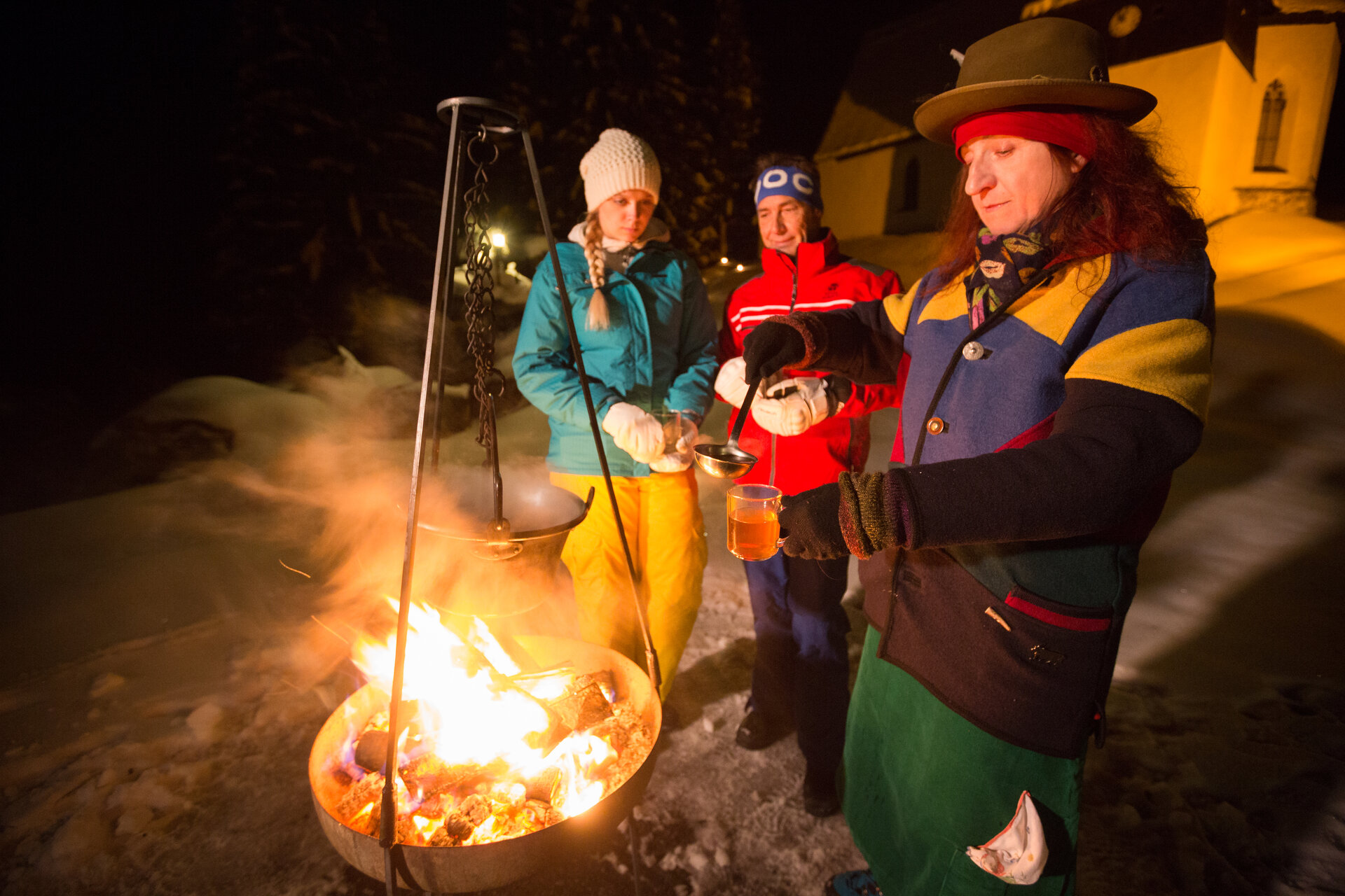 Nach der vereinten nächtlichen Bergfahrt mit der Montafoner Kristbergbahn geht es ganz gemütlich die ca. 250 Meter bis an die Bergknappenkappelle St. Agatha, wo es die ersten Sagen und Geschichten gibt. Als wärmenden Zwischengang gibt es ein heißes alkoholisches bzw. alkoholfreies Getränk aus dem Kupferkessel beim Bergknappenbrunnen. Anschließend geht es in die warme Stube vom Panoramagasthof Kristberg, wo Geschichte in Geschichten und eine feine 3-gängige kulinarische Reise ins frühzeitliche Montafon sich abwechseln.