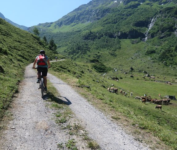 Dort stellten wir das E-Bike ab und gingen gemütlich zu Fuß die letzten 300 Höhenmeter zur Tilisunahütte. Wir hatten ein traumhaftes Wetter, allerdings auch über 30 Grad. Deshalb hielten wir auch immer wieder für kurze Trinkpausen an. Nach insgesamt 1.500 Höhenmeter freuten wir uns schon über ein kaltes Getränk, Spinatknödel, Topfenstrudel und Kaffee... sehr lecker. Bis es nach einer Stunde Stärkung und ausruhen wieder zu Fuß zur Tilisunaalpe und dann mit dem E-Bike zum Hotel Montabella in Latschau ging. Dort haben wir gemeinsam noch etwas getrunken und Montafoner Sura Kees verkostet - ein perfekter Abschluss! Anschließend ging es zurück nach Schruns, wo wir uns von unserem Bike-Guide Markus verabschiedeten und nach einem gelungenen Tag sehr zufrieden nach Hause gingen.