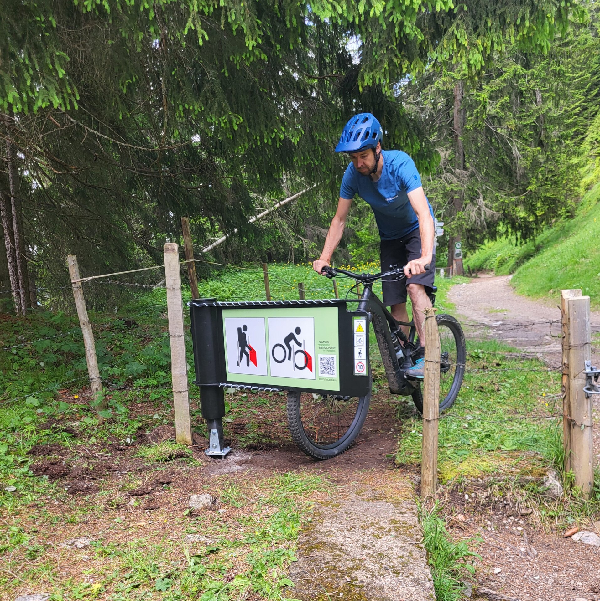 Ein weiteres innovatives Element ist das Flow Gate – ein spezieller Zaundurchgang, der es Dir ermöglicht, ohne Absteigen mit dem Mountainbike durchzufahren. Das Tor schließt sich automatisch, sodass keine Weidezäune offenbleiben und die landwirtschaftliche Nutzung nicht beeinträchtigt wird. Für Wanderinnen und Wanderer gibt es einen Henkel, mit dem sich das Tor ohne Berührung der elektrischen Weideeinzäunung öffnen lässt.
